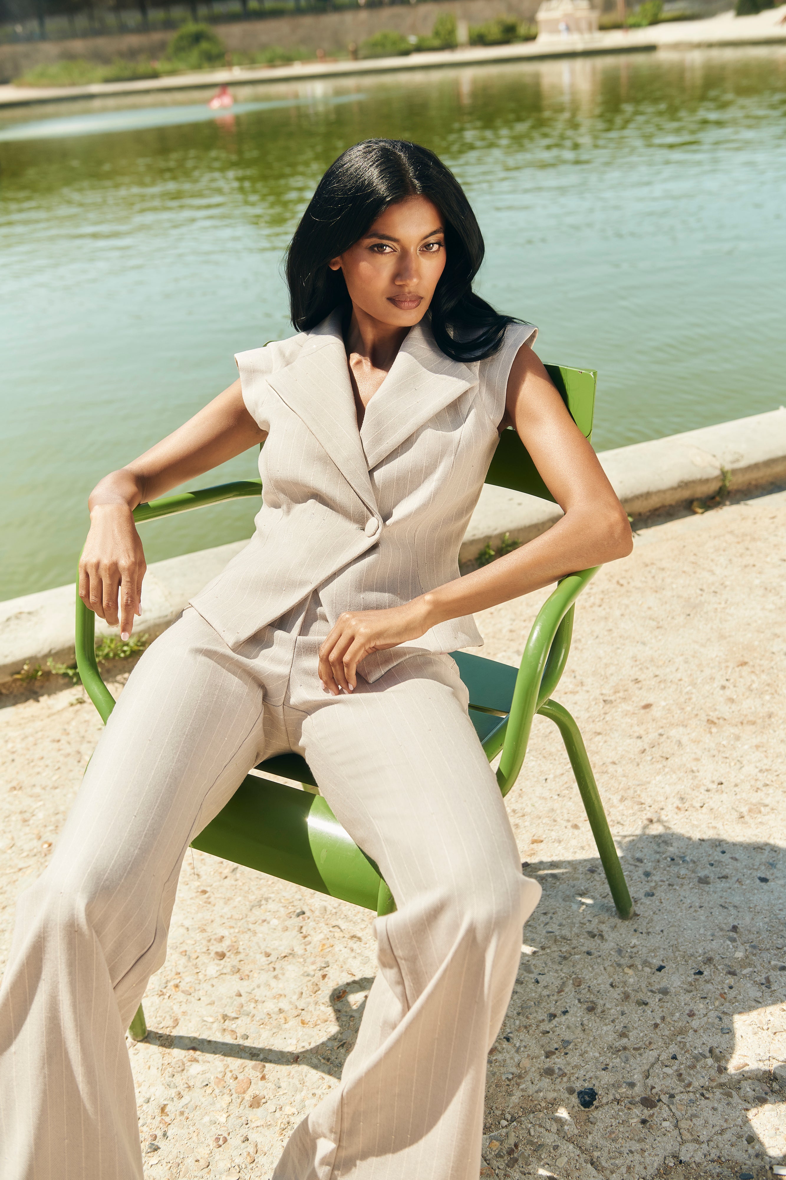 Este elegante chaleco con rayas diplomáticas es parte del set Alexandra, compuesto por chaleco y pantalón, confeccionado en sarga con micro lentejuelas.