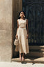 La falda Palmar destaca por su precioso corte midi de nesgas  con vuelo, decorado con cinta decorativa blanca y beige en la cadera