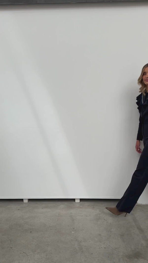 Su diseño presenta un cuerpo entallado con manga larga que se ajusta a la perfección, contrastando con un pantalón de pernera recta que estiliza y alarga la figura, creando una silueta impecable. El cierre frontal con cinco botones ocultos y cremallera asegura un ajuste cómodo y limpio. Esta pieza es la alternativa perfecta al vestido tradicional, un look con personalidad y carácter.