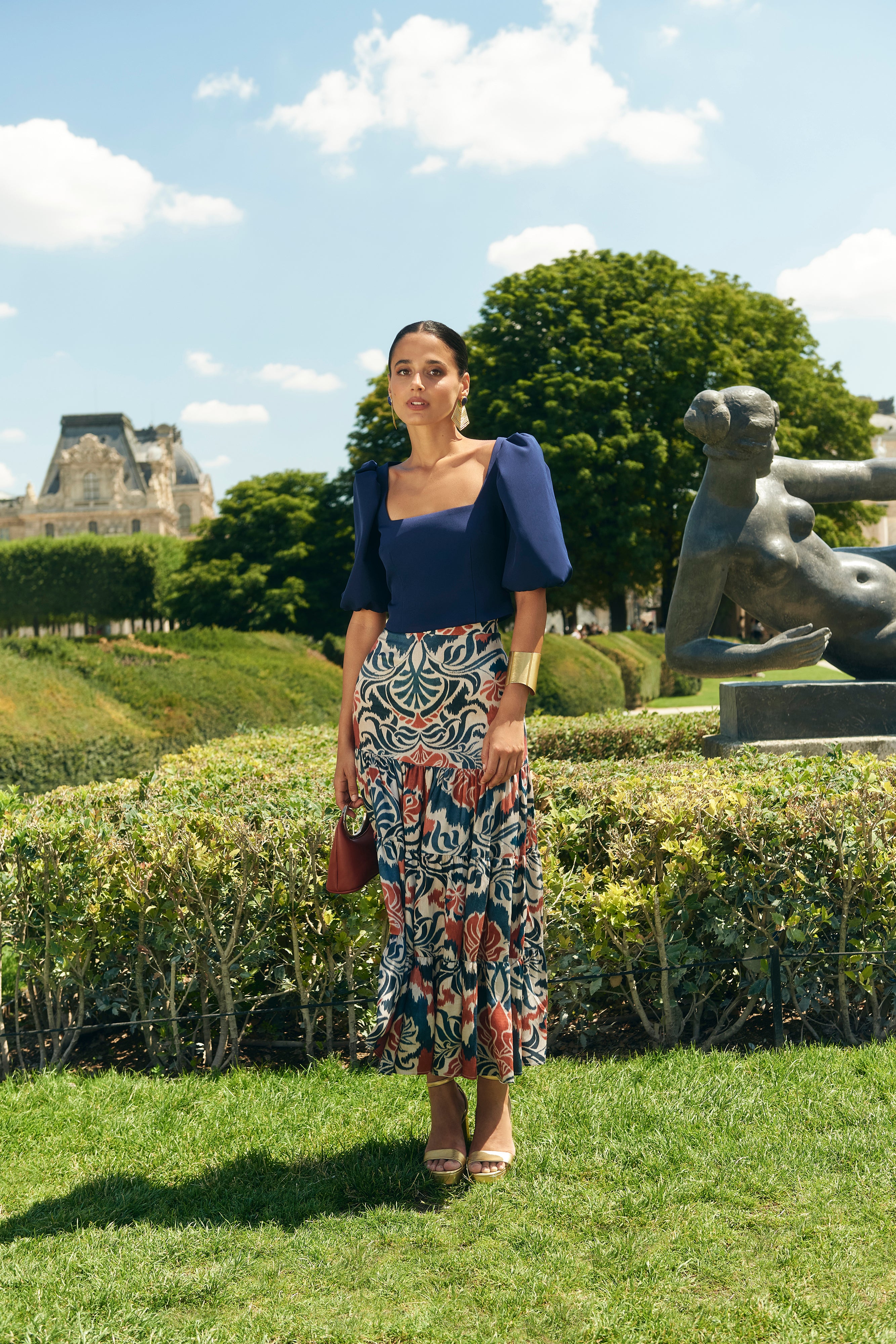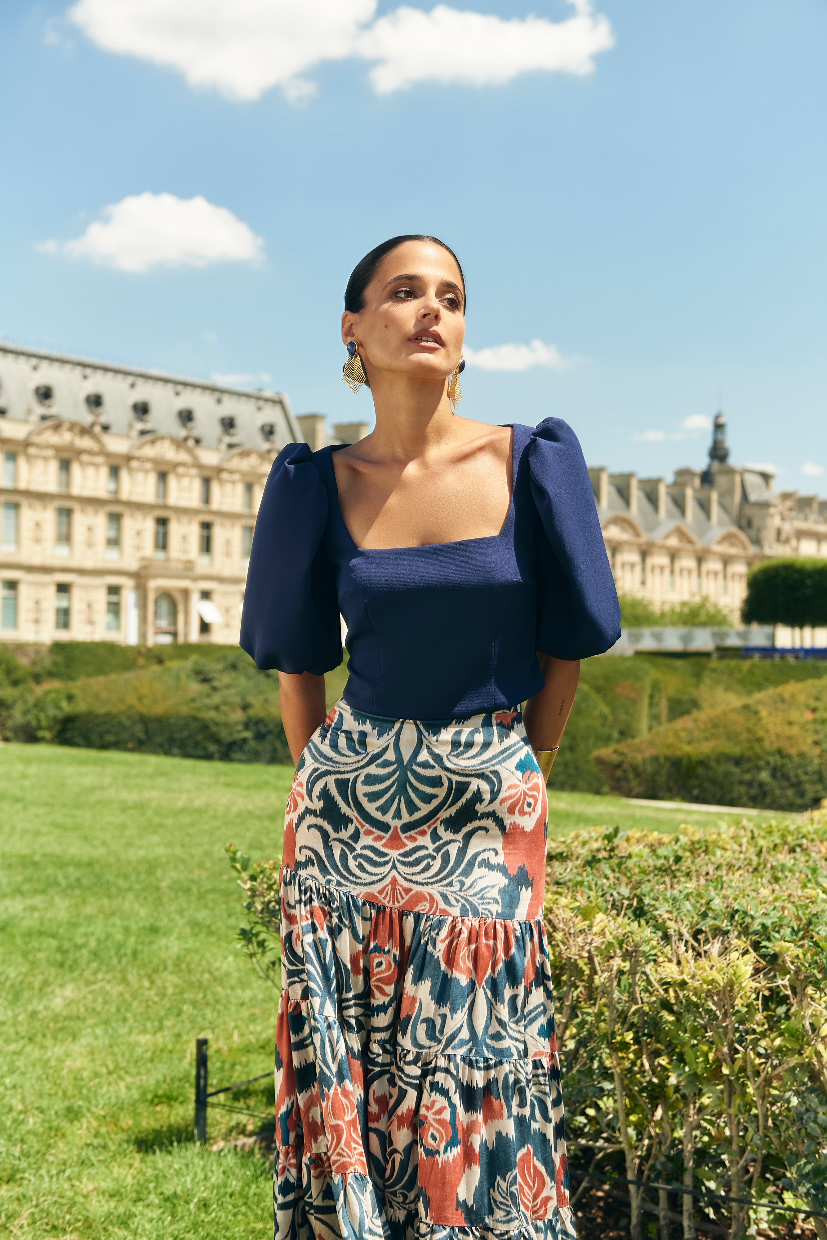 Te presentamos nuestro Top Fleur en un elegante tono azul, una prenda con carácter y estilo que eleva cualquier look de invitada tanto de verano como se invierno.