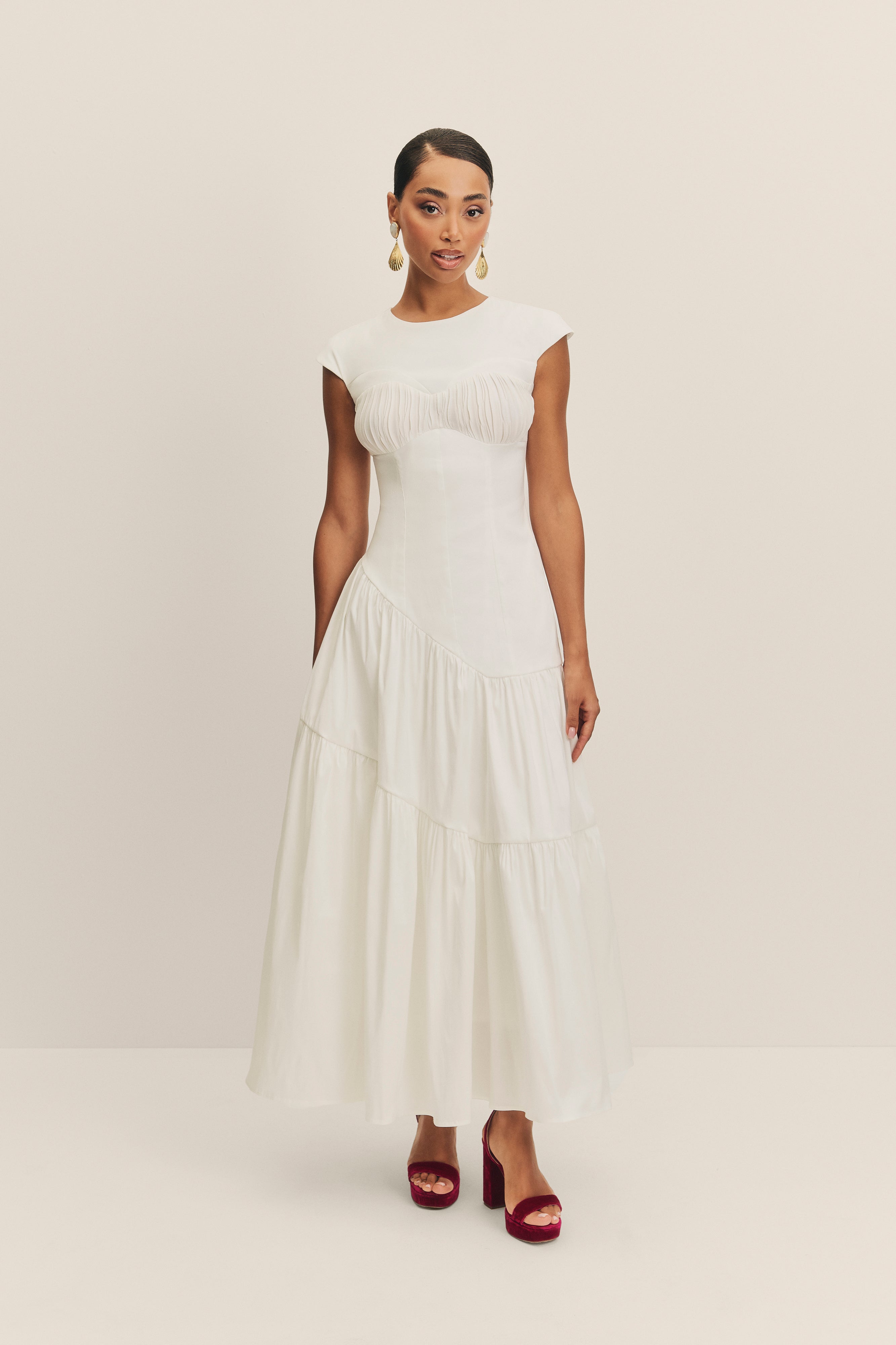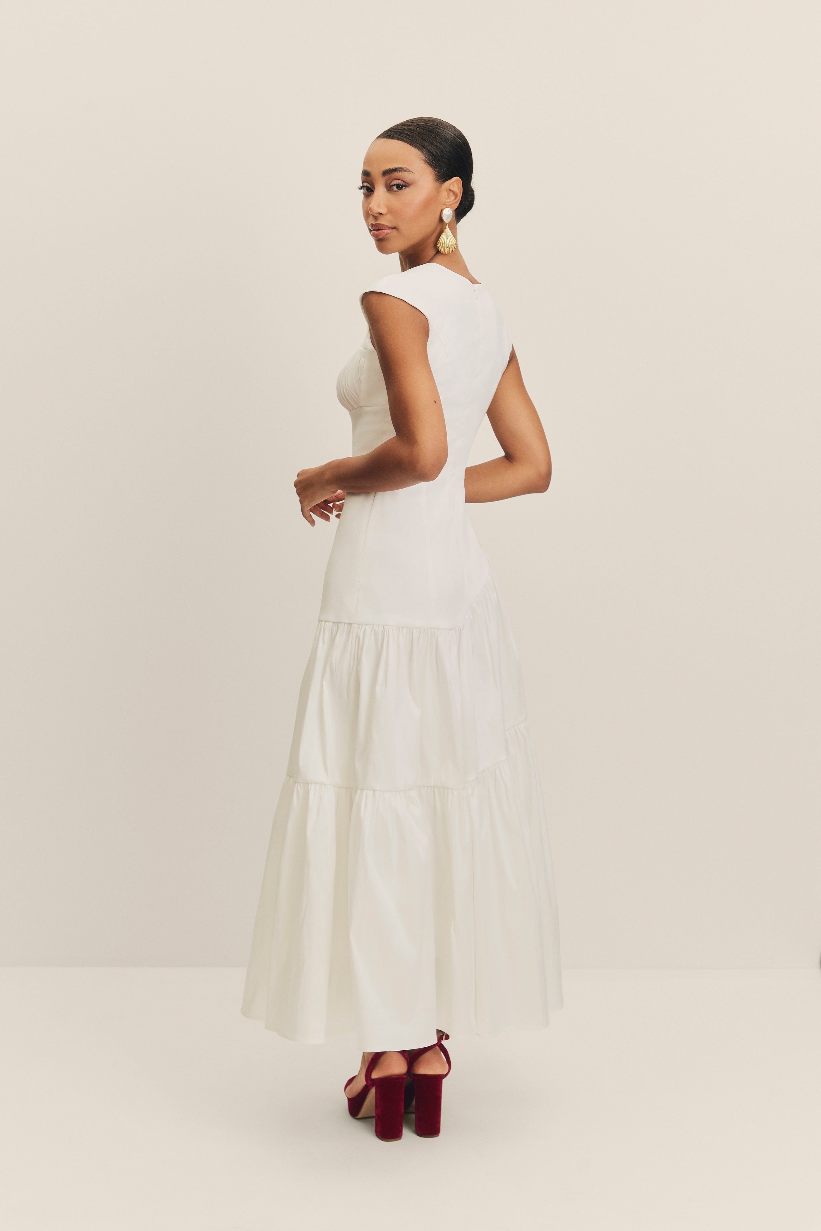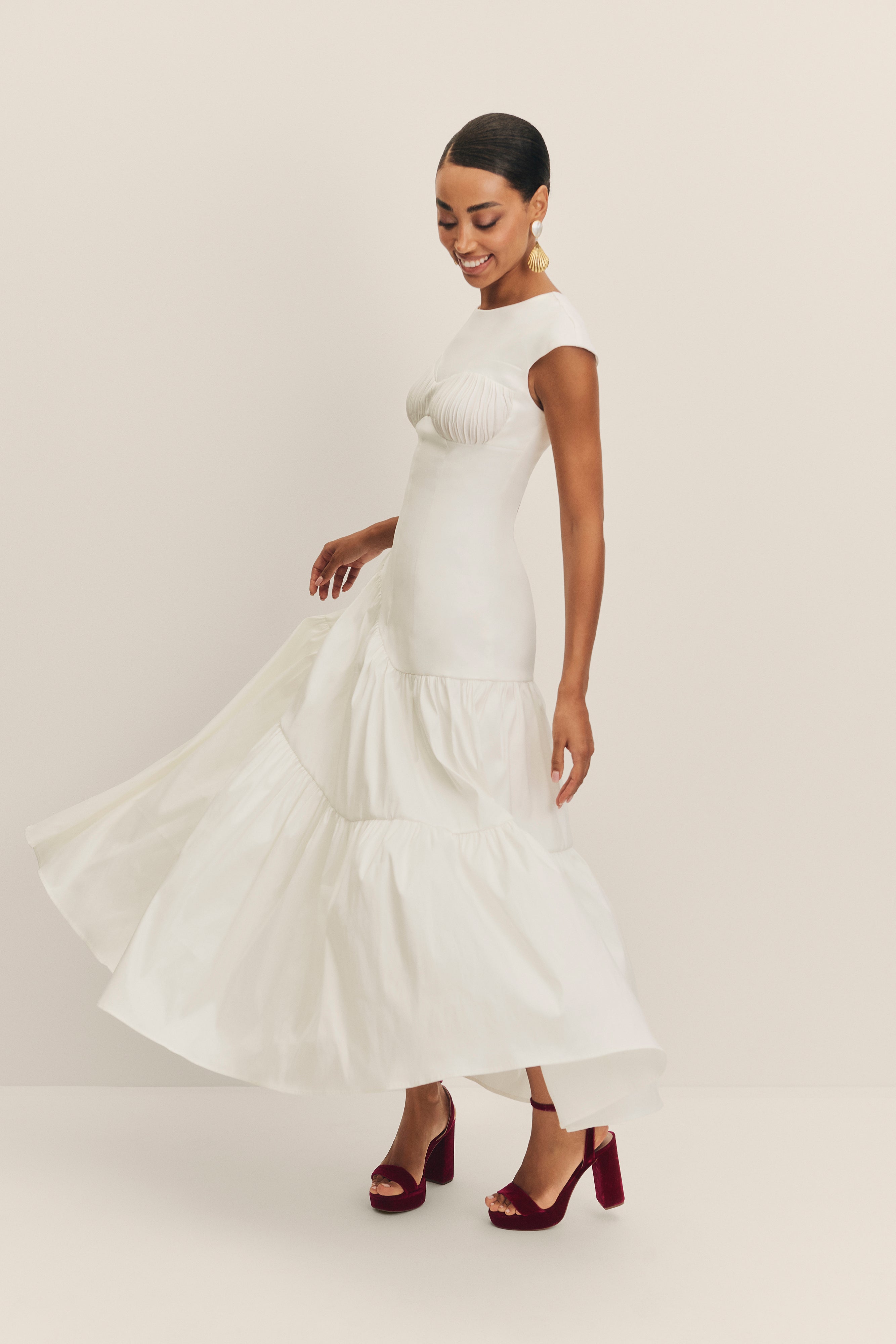 Descubre la magia del vestido de novia Celine Midi en blanco, una creación que combina la pureza del color nupcial con la delicadeza del tafetán texturizado, un tejido que refleja la luz con un brillo sutil y envolvente.