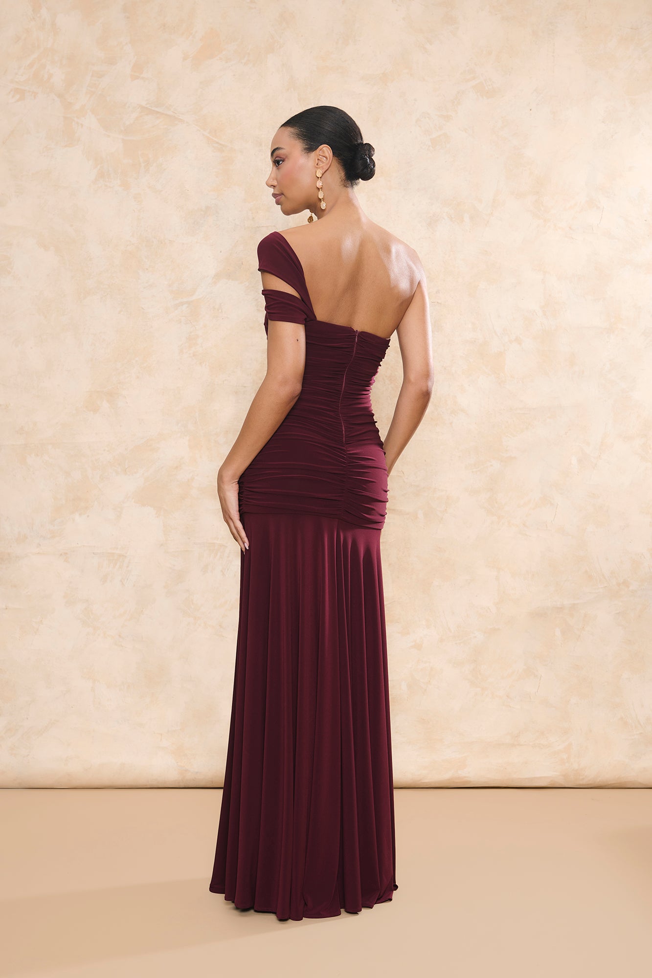 El vestido Cumbia se distingue por su confección en punto de seda y su escote asimétrico. Este elegante diseño cuenta con un tirante de doble cruce asimétrico y fruncidos laterales que llegan hasta la altura de la cadera. La falda, con corte de capa larga y abertura lateral, aporta un movimiento fluido y dinámico al conjunto.