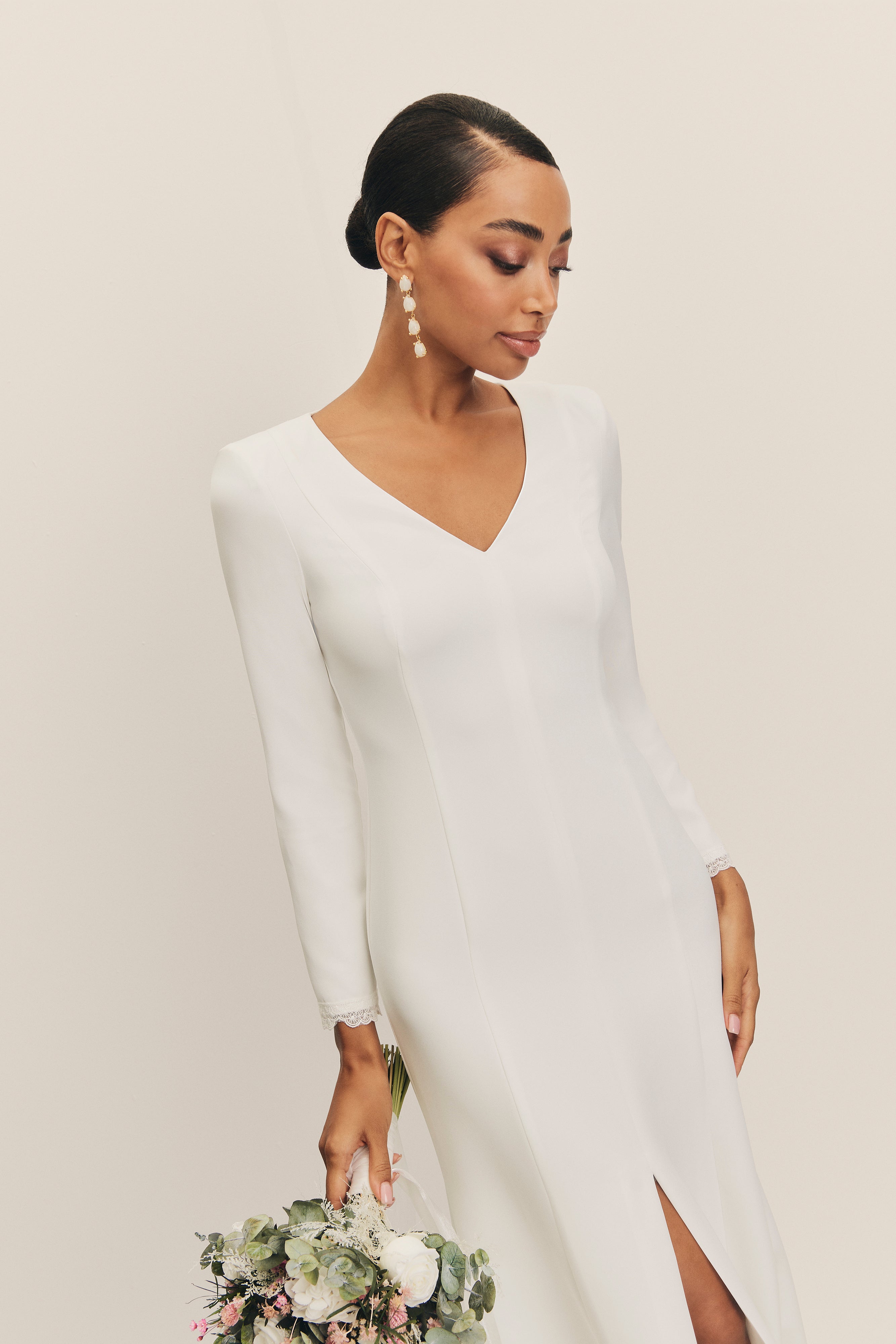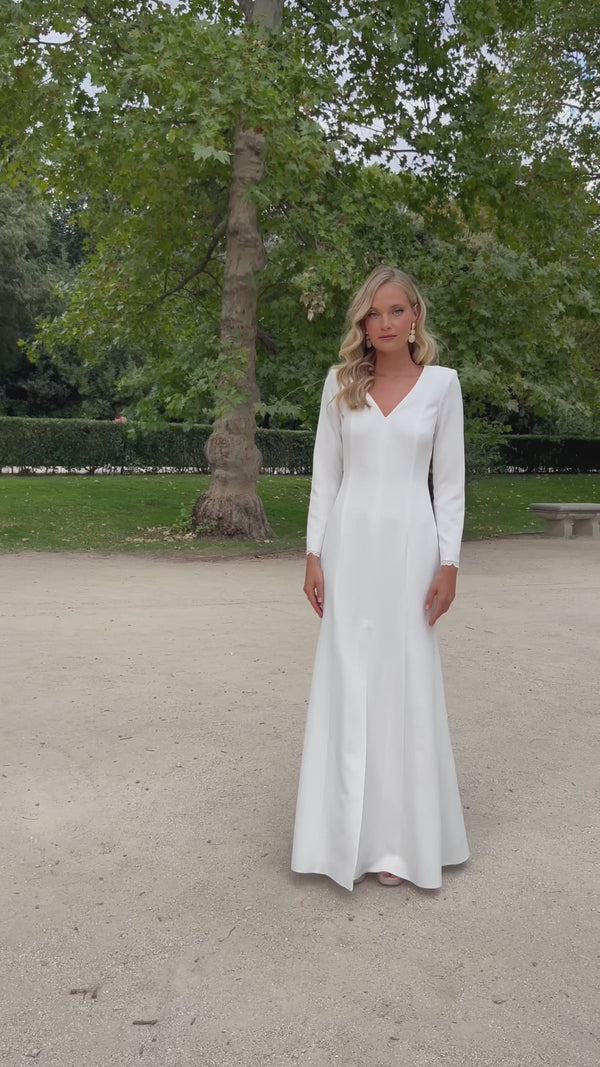 Su escote en pico estiliza el torso y aporta un toque de feminidad sutil, mientras que las hombreras estructuradas otorgan fuerza y carácter, creando un equilibrio perfecto entre delicadeza y poder. Las mangas largas, de corte sencillo, refuerzan su esencia atemporal, pensada para una novia que busca la belleza en la simplicidad.