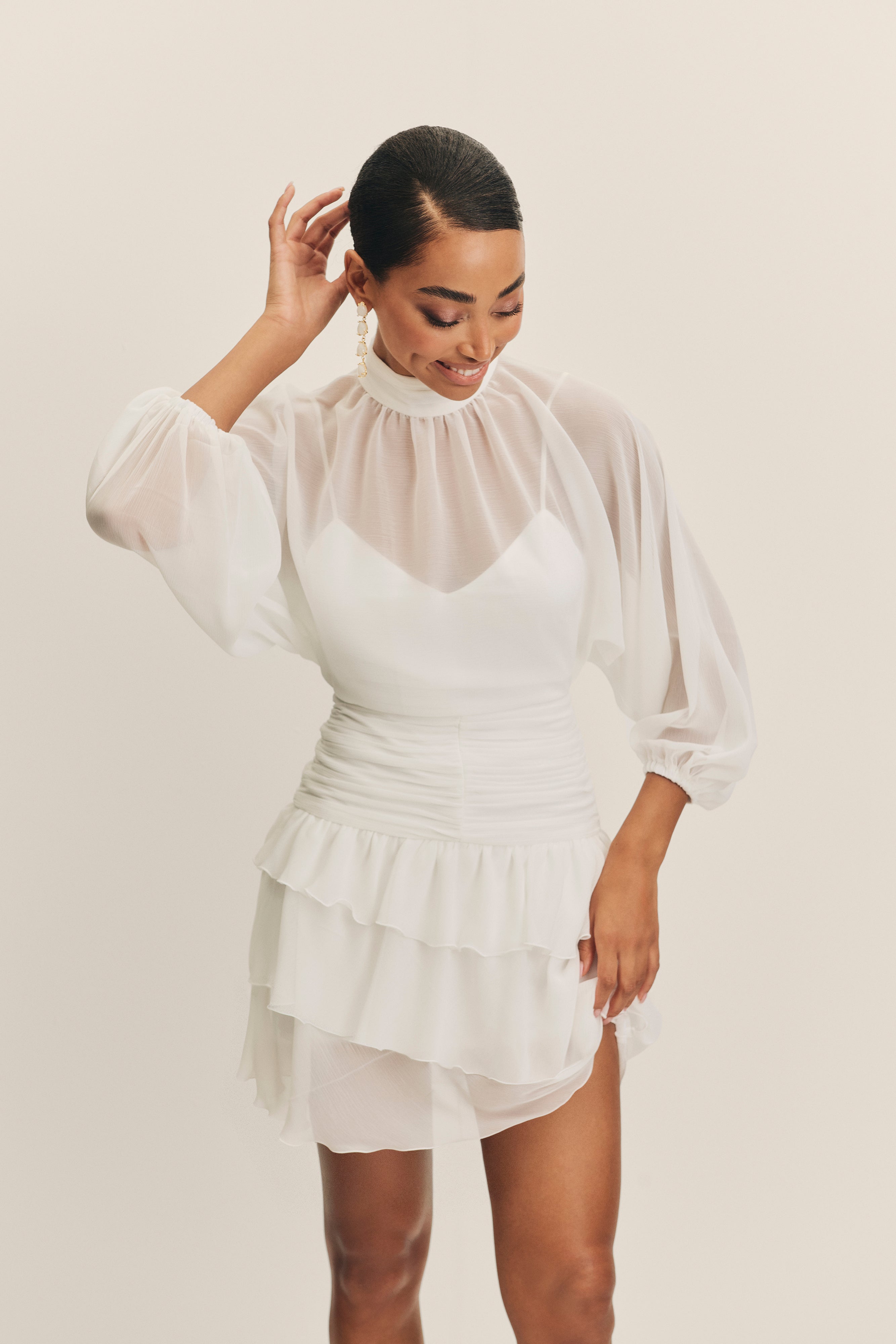La silueta se define con un fajín drapeado que abraza la cintura, estilizando la figura y aportando estructura, mientras que la falda mini de tres volantes suaves aporta ligereza, movimiento y un encanto juvenil, ideal para una novia que quiere sentirse libre en su gran día.
