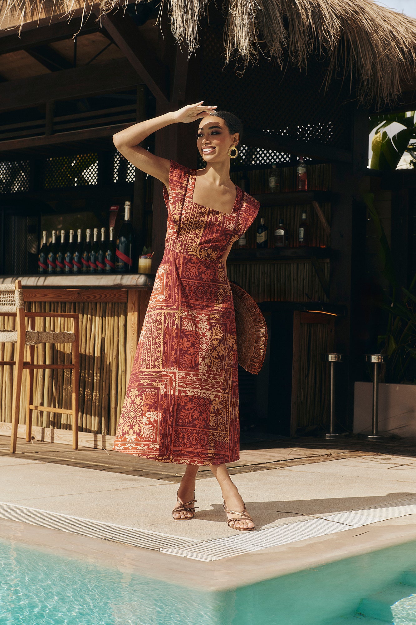 El Vestido Gardenia está confeccionado en algodón de alta calidad, Su estampado geométrico en tonos tierra hace que el modelo sea único y especial. Destaca por su escote frontal cuadrado, además incorporan una delicada línea desde el escote delantero hasta la espalda compuesto por una  fornitura de bolillo en color granate. Presenta unos tirantes con manga de sisa, estos tirantes crean una solapa desde el pecho hasta el hombro. Además su espalda contiene un cierre superior con ocho botones dorados, que termina dando paso a un elegante escote en espalda terminando en la cintura aportando sensualidad, incorpora un forro de algodón en la parte superior para un mayor ajuste y comodidad.