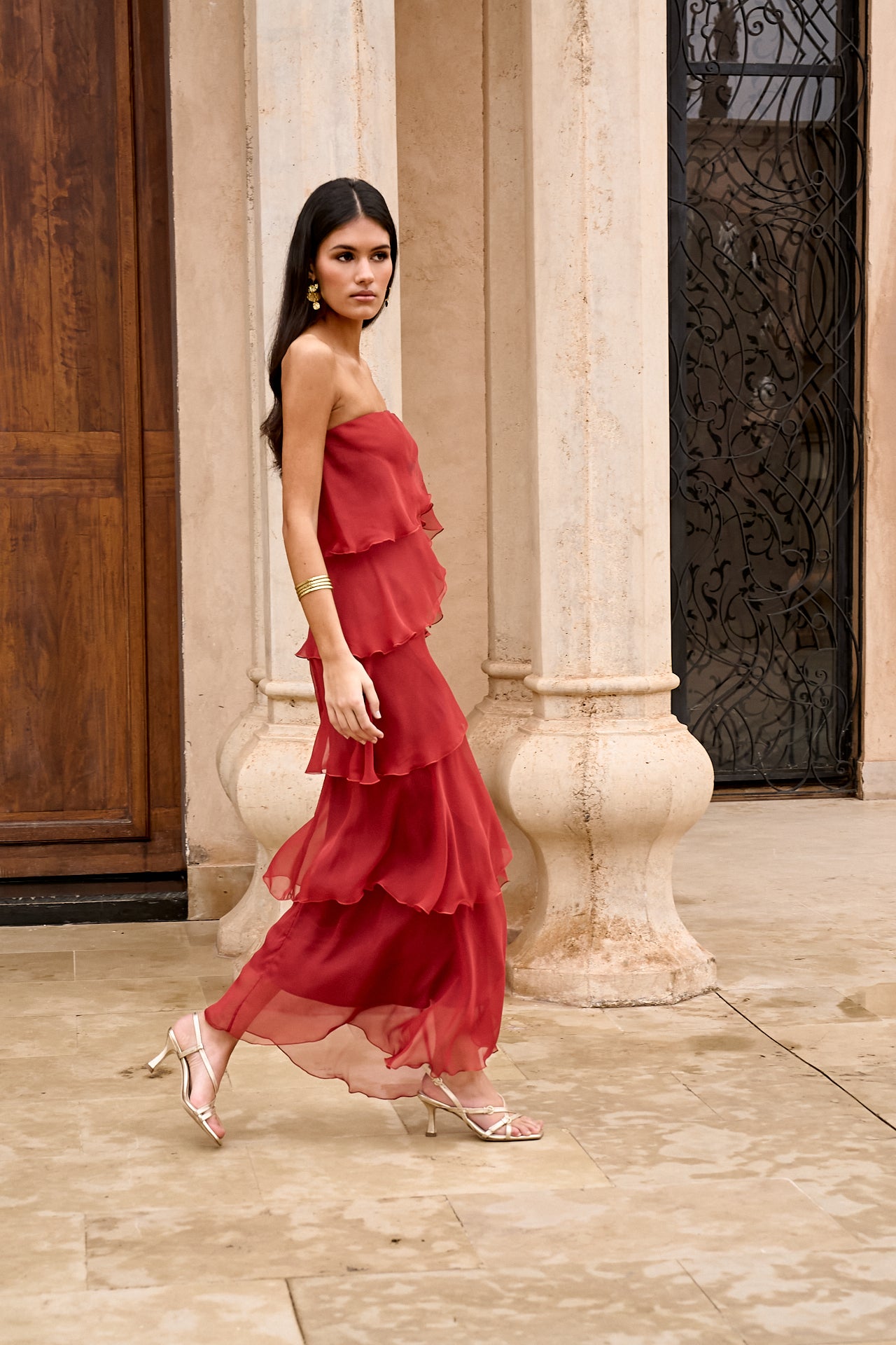 La silueta del vestido es desenvuelta, ya que el cuerpo está decorado con capas superpuestas de gasa con formas asimétricas, creando un efecto de movimiento y delicadeza. La falda larga continúa el diseño en volantes suaves en cascada, aportando un volumen ligero y un acabado etéreo.