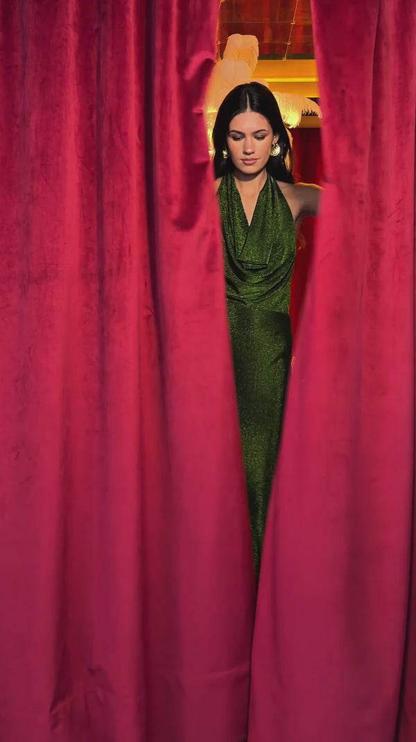 El Vestido Nova Verde irradia luz propia: un vestido de fiesta que envuelve la figura con magnetismo moderno y una elegancia sutil. Su silueta columna y largo maxi dibujan una línea continua y esbelta, mientras el tejido de brillo metalizado en verde esmeralda eleva cada movimiento con destellos líquidos. El escote halter drapeado tipo cowl, anudado al cuello, se funde con una espalda al aire que deja un rastro de sofisticación; la cremallera trasera invisible y el forro interior garantizan un ajuste cómodo y pulido de principio a fin. Perteneciente a la colección Secret Glow, está pensado para cenas de empresa y noches de Navidad donde la luz es protagonista. Perfecto para eventos formales, cócteles y celebraciones que piden presencia sin esfuerzo; un diseño que se adapta con naturalidad a tus planes más especiales.
