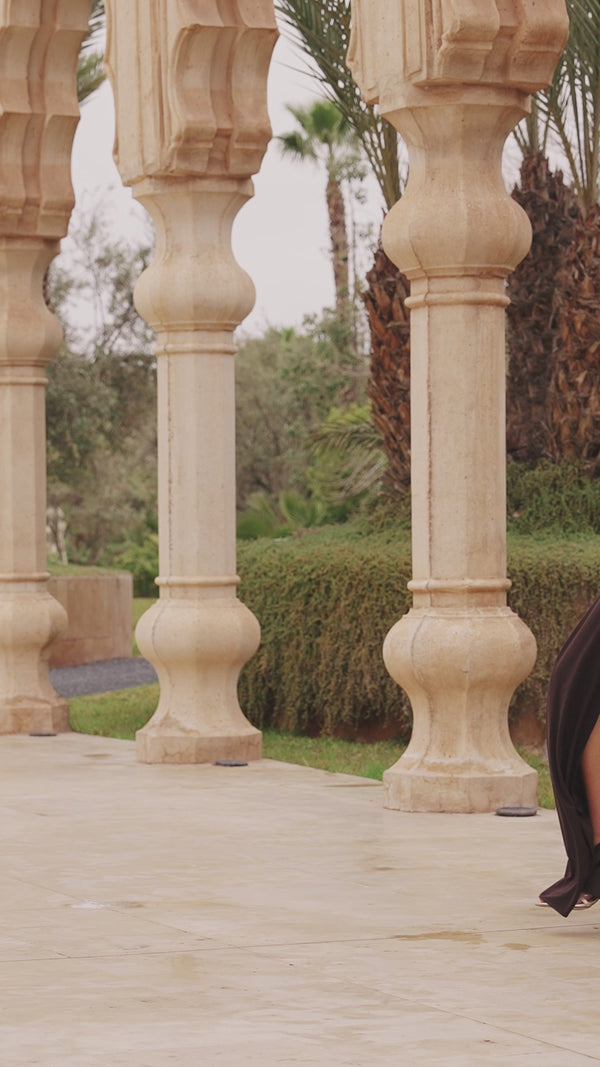 El diseño del vestido Sohra Marrón chocolate evoca una elegancia natural y magnética. Su escote tipo halter, con un delicado drapeado frontal, envuelve el cuello con suavidad para desembocar en una espalda totalmente descubierta, aportando un equilibrio perfecto entre la sobriedad y la sensualidad.