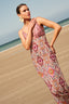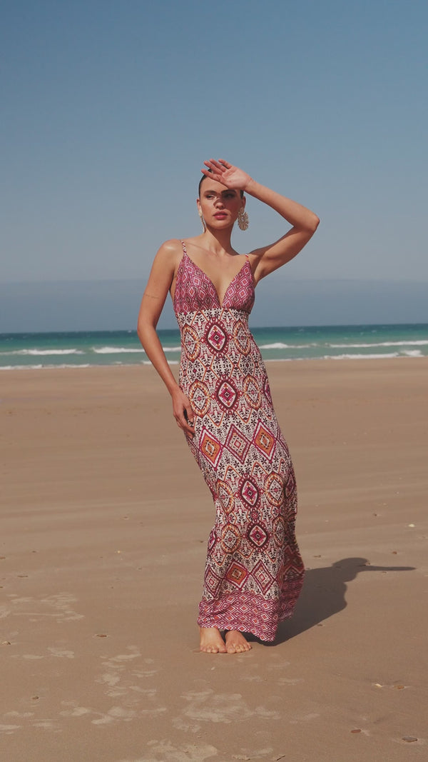 Descubre nuestro Vestido Soraya Largo en estampado geométrico en tonos rosados, confeccionado en viscosa de alta calidad.